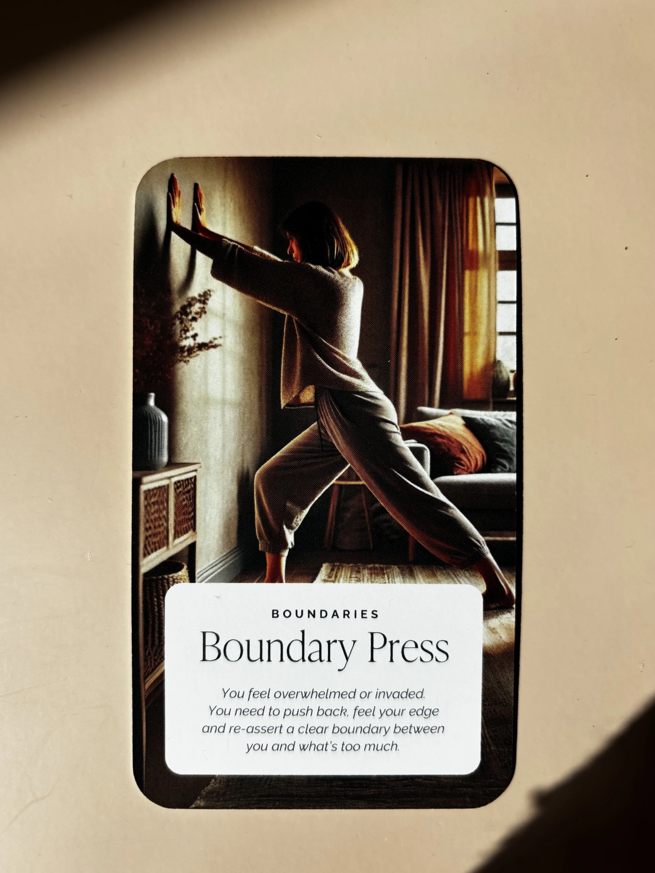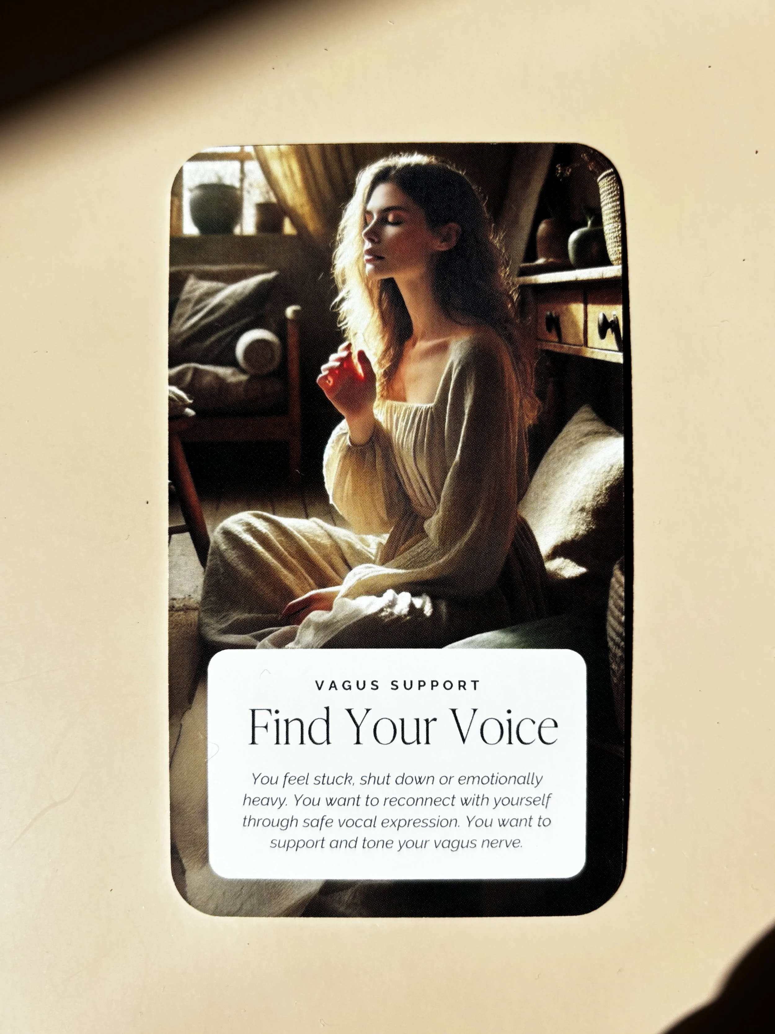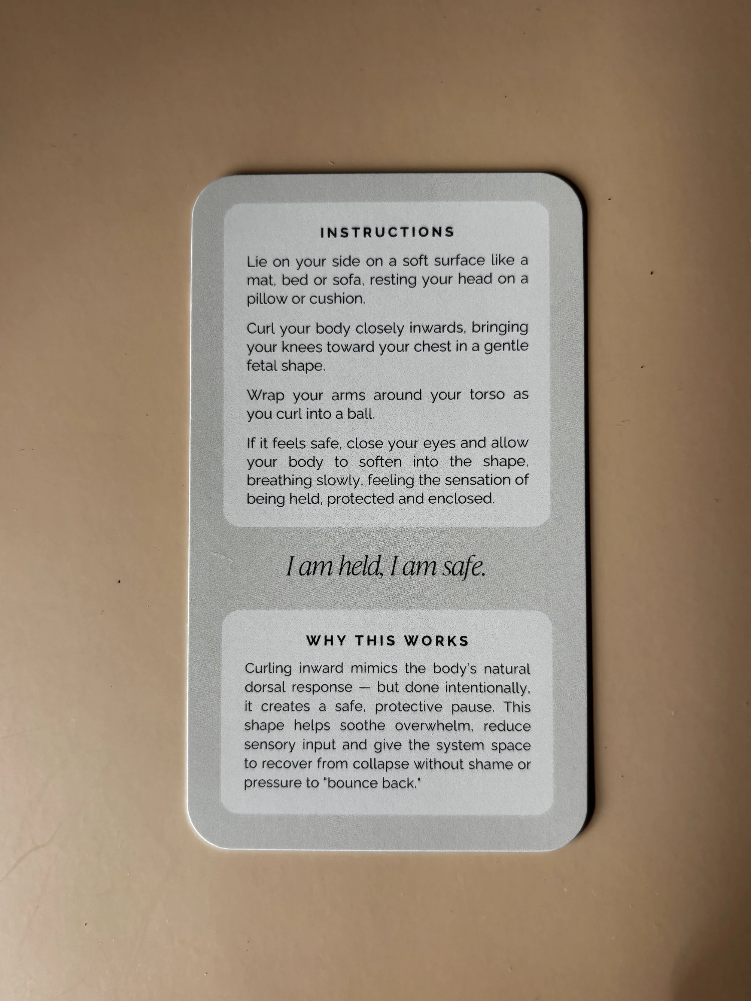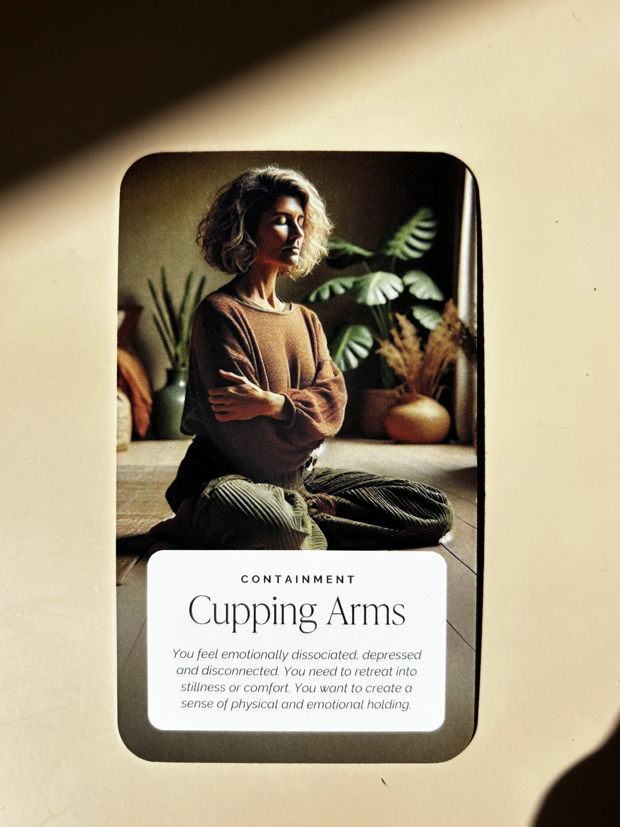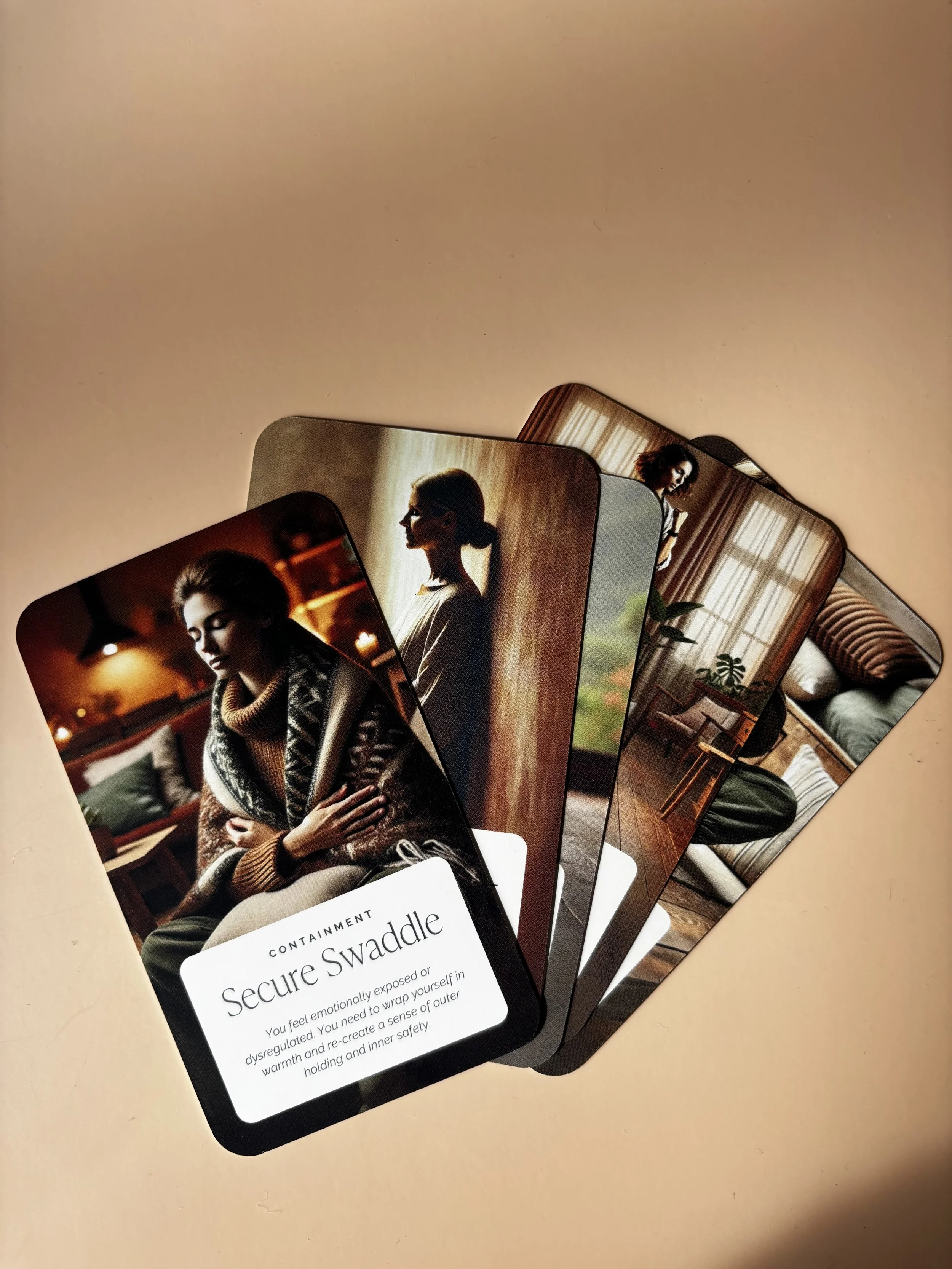 Each card is paired with warm, carefully chosen imagery designed to evoke a sense of calm and safety. The visual cues support the nervous system in settling, helping the body engage with the practice in a natural and accessible way.